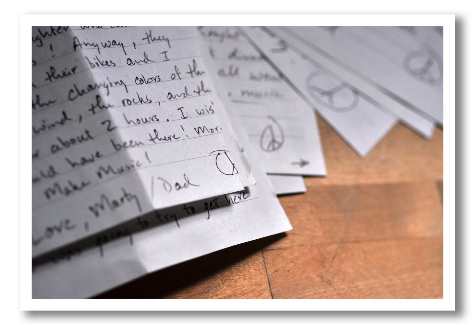 The rest of it was details of the flight, the weather forecast (it’s always 115 when he lands in Vegas), his hopes for the trip, a request for us to “play music!” and a peace sign. A day or two later, a three-page letter arrived. It was on the same lined paper, ripped out of a bound journal, and it ended with the usual peace sign and a reminder to play music. On Monday, we got another letter, ripped more sloppily so that we had to fill in the words on the edge, Serena and I sharing the pages and reading like it were an adventure, like we were some sort of pioneers who received the note by pony. This one was written at the site of the Mountain Meadows Massacre, Marty recounting the story of slaughtered women and children. It started on a bummer but ended with his having held an impromptu concert at the top of [secret camping location] for a troop of teenage bicyclists and their chaperones on their summer adventure program. “Make music!” he said again at the end, the peace sign torn at the edge.