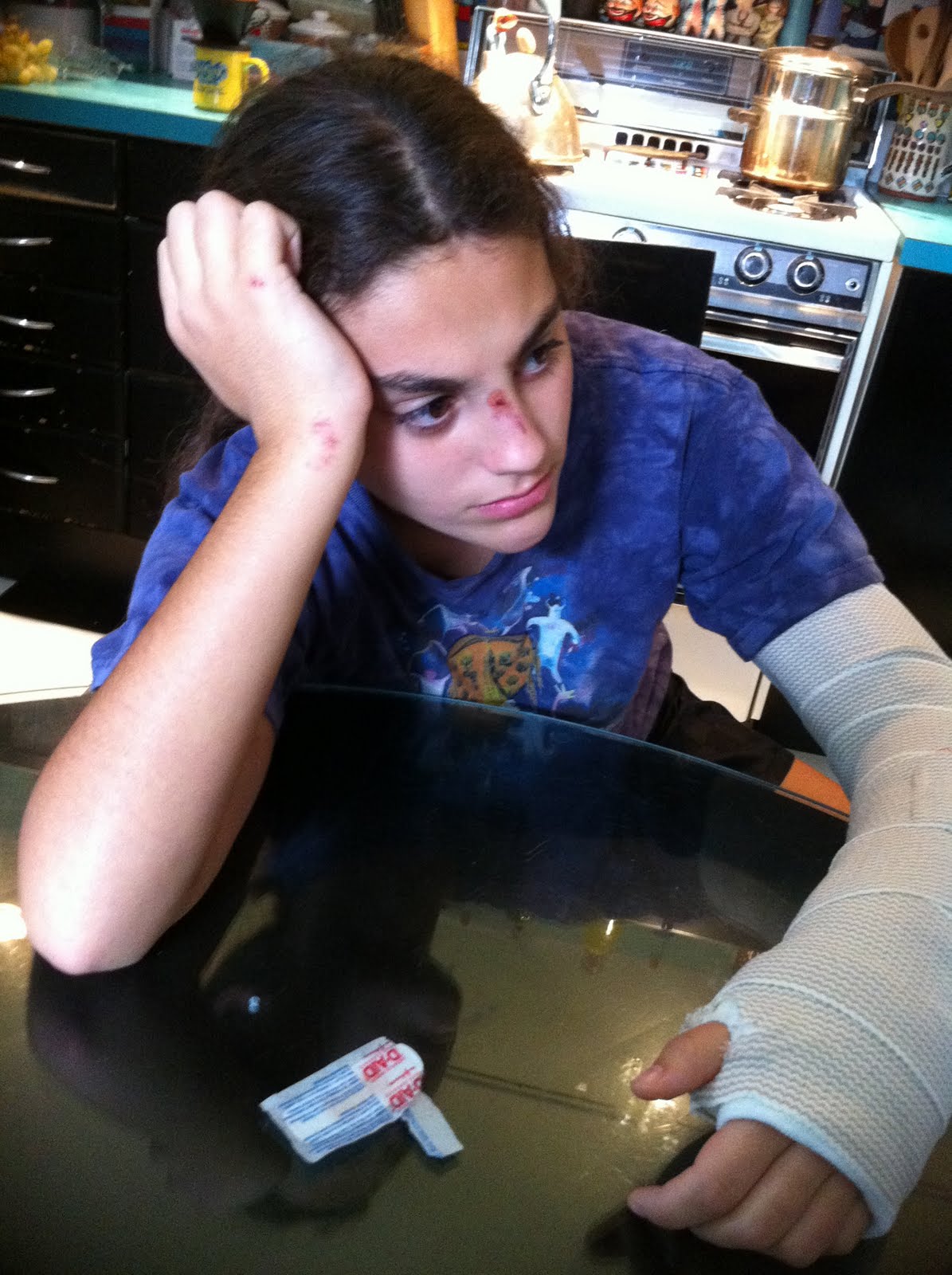Our doctor says that Serena’s x-rays indicate a fracture, but he is waiting for confirmation from an orthopedist. He tells us a nurse will come and clean Serena’s wounds, and goes to sit at his desk and eat. He sits there for a good thirty minutes, while the nurse, who sees me lurking in the hallway and apologizes each time, saying, “I’m coming,” finally does come with an armload of stuff to clean up the blood that’s dripping from her chin and head.